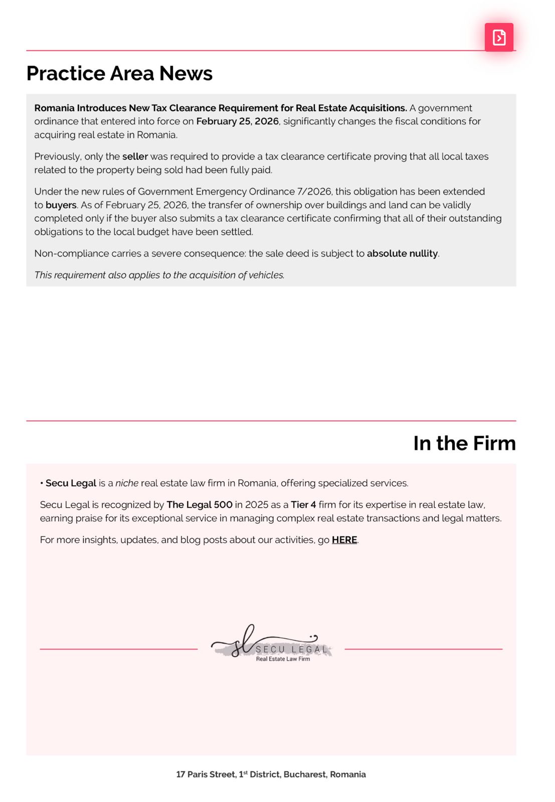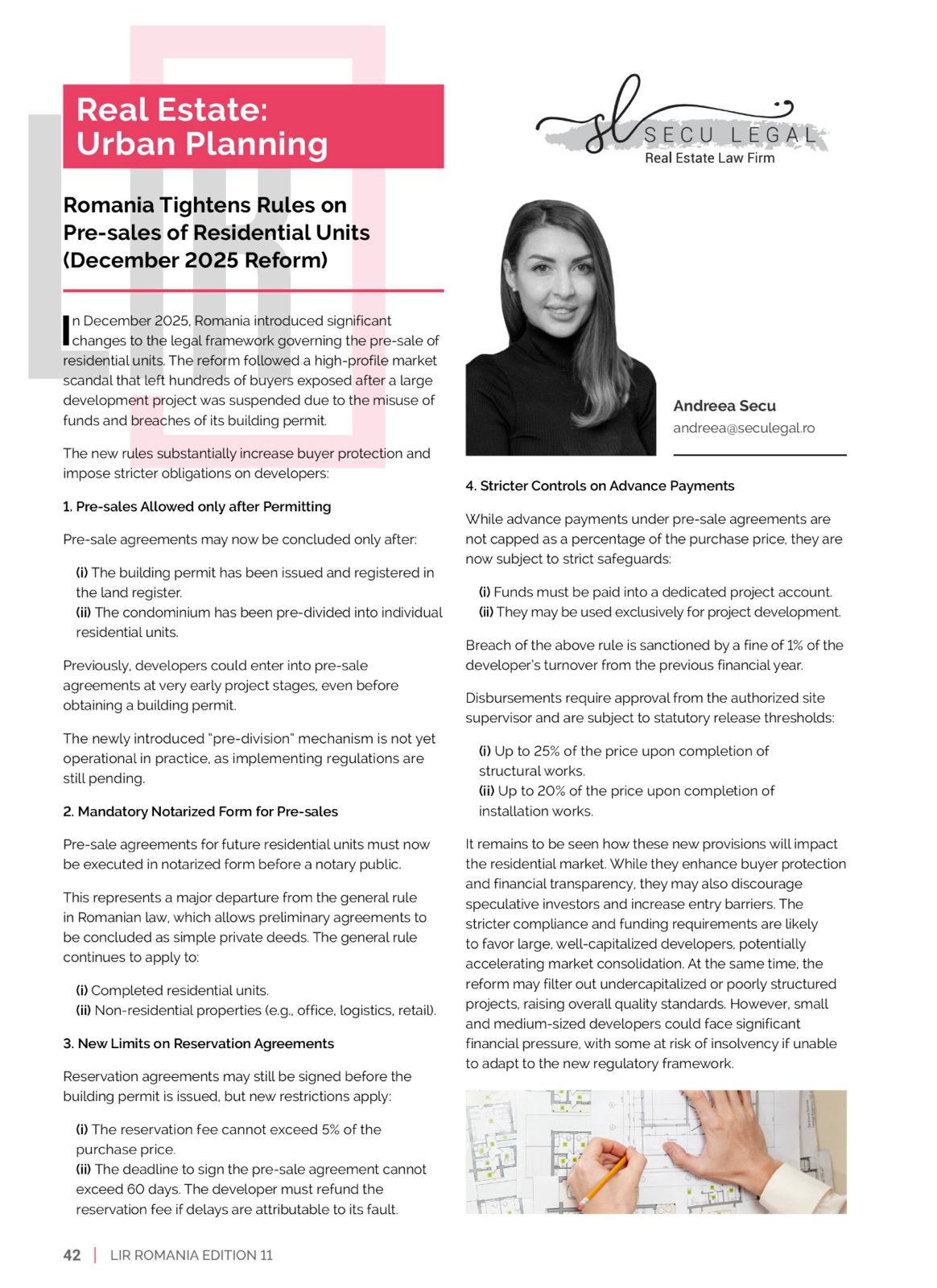 We are delighted to announce the publication of our new article „Romania Tightens Rules on Pre-sales of Residential Units (December 2025 Reform)”, authored by Andreea Secu featured The Legal Industry Reviews (LIR) Romanian Edition | March 2026.